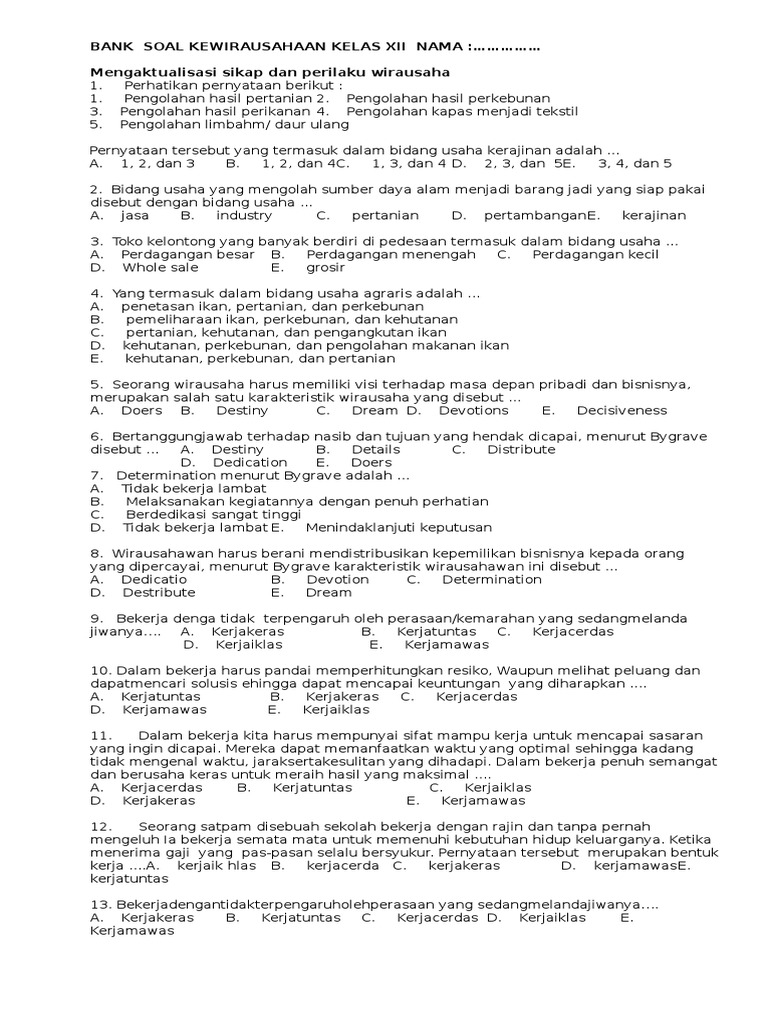 Perusahaan harus mengirimkan barang/jasa sesuai dengan keinginan (spesifikasi) konsumen tanpa berubah sedikit pun. Jumlah soal sebanyak 50 butir, pada setiap butir soal terdapat 5 (lima) pilihan jawaban. Jun 05, 2020 · contoh soal uas/pat prakarya & kwu kelas 11 semester 2 k13 pembelajaran prakarya dan kewirausahaan bagi peserta didik pada jenjang pendidikan menengah kelas xi mencakup aktivitas dan materi pembelajaran yang secara utuh dapat meningkatkan kompetensi pengetahuan, keterampilan, dan sikap yang diperlukan untuk menciptakan karya nyata, menciptakan peluang pasar, dan menciptakan kegiatan bernilai. Laporkan kepada pengawas ujian apabila terdapat lembar soal yang kurang jelas, rusak, atau tidak lengkap. Berikut di bawah ini soal prakarya dan kwu kelas 11 semester genap dilengkapi kunci jawaban dengan pertanyaan dimulai dari nomor 1.