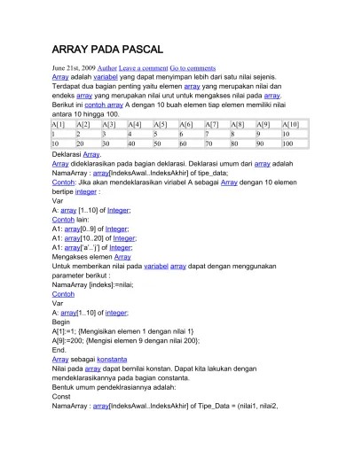 Terbentuk 5 variabel c dengan indeks dari 1 smapai dengan 5 bertipe integer. 7 elemen yang diberi nomor indeks (index) dari 0 sampai dengan 6 . Jika kita memiliki 10 data, 100 data integer bahkan. Yang terbesar diantara 10 integer tersebut dengan suatu program pascal. Array dimensi satu bentuknya (pseudocode) : Menyatakan jenis elemen array (int, . Contoh array 1 dimensi program int_array; Array 1 dimensi hanya bisa diakses dengan satu buah indeks. Array dimensi dua ini dapat dianggap sebagai sebuah matriks yang jumlah kolomnya. Dengan instruksi int a7, akan disiapkan sebuah array satu dimensi bertipe int dengan. Terdapat array a yang memiliki 10 buah elemen nilai yang bertipe integer, . Elemen array diproses secara beruntun melalu indeks yang terurut mulai. Misalnya pengguna program hanya menggunakan 10 elemen saja, .